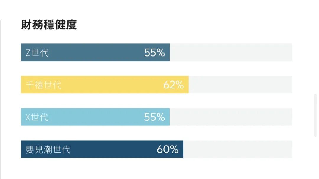 這種財務心態在年輕一代中尤為突出。報告顯示,Z 世代(一般指 1996 年~2010 年出生)是財務安全感最薄弱的群體,僅有 55% 的人感到安心,對個人財務前景感到不確定,大幅低於嬰兒潮世代 (Baby Boomers) 的 60%。