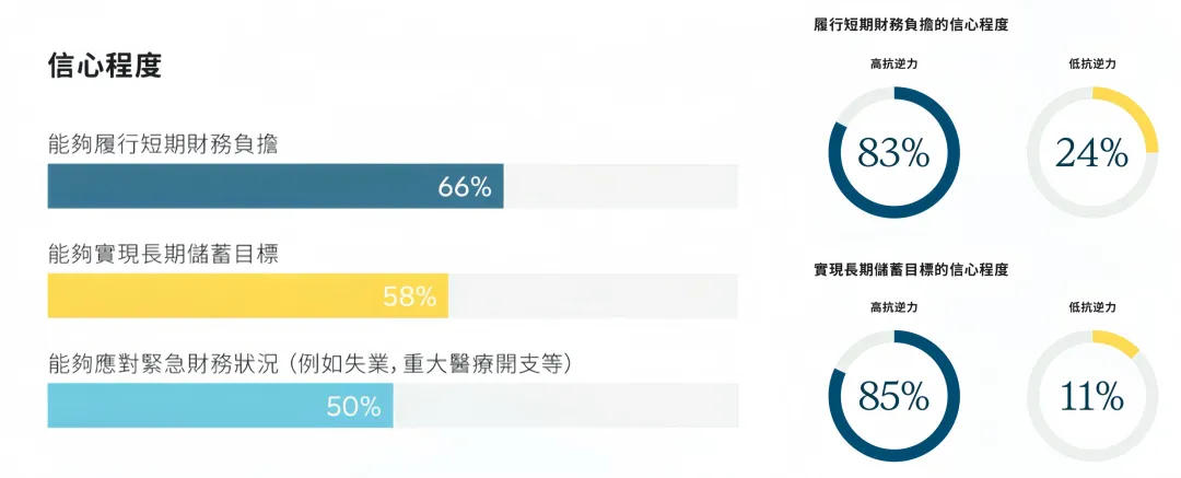 第一道是信心與準備的錯位鴻溝。 不少人總覺得「自己的錢夠安全」,但這種安全感多是盲目樂觀。數據顯示,僅一半受訪者有信心應對緊急財務狀況,可超七成的人,儲蓄根本撐不過失業或重病時六個月的生活開銷。這種認知與現實的錯位,成為財務生活中潛在風險的來源。