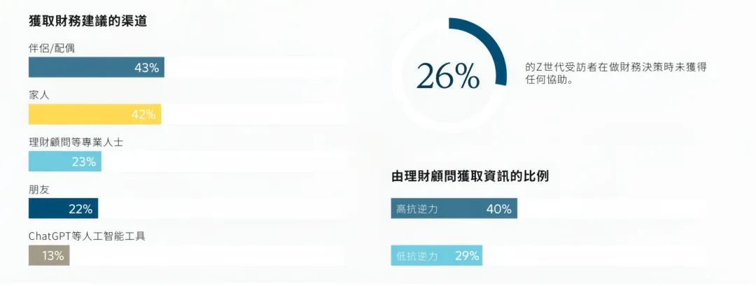 第三道是專業認知的偏差鴻溝。數據顯示,大多數人選擇向熟悉的人諮詢投資意見,而非專業顧問。然而,財務韌性越高的人群,使用專業顧問的比例也越高。這顯示在複雜的經濟環境中,專業顧問能提供系統化的規劃與持續性的引導,這對跨越上述鴻溝來說至關重要。尤其對於財富結構更複雜、有跨代際規劃需求的家庭而言,傳統的財務顧問服務或許仍顯不足。