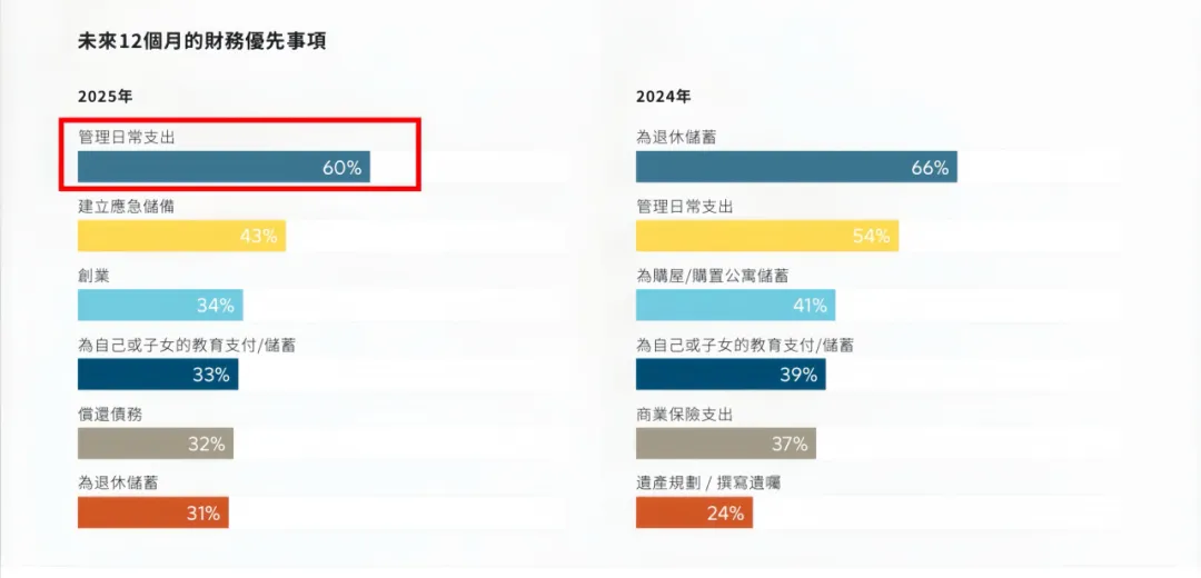 調查數據清晰顯示,在經濟不確定性加劇、生活成本持續上漲的背景下,公眾的財務行為出現了顯著變化。其中最明顯的趨勢是,一種著眼於當下的**「短期主義」正在悄然蔓延。高達 60% 的受訪者將「管理日常預算」視為未來一年的首要任務,同時「建立應急基金」的重要性也迅速攀升至第二位(43%)。與此形成鮮明對比的是,像「退休儲蓄」**這類長期目標,其優先級已跌至第六位。
